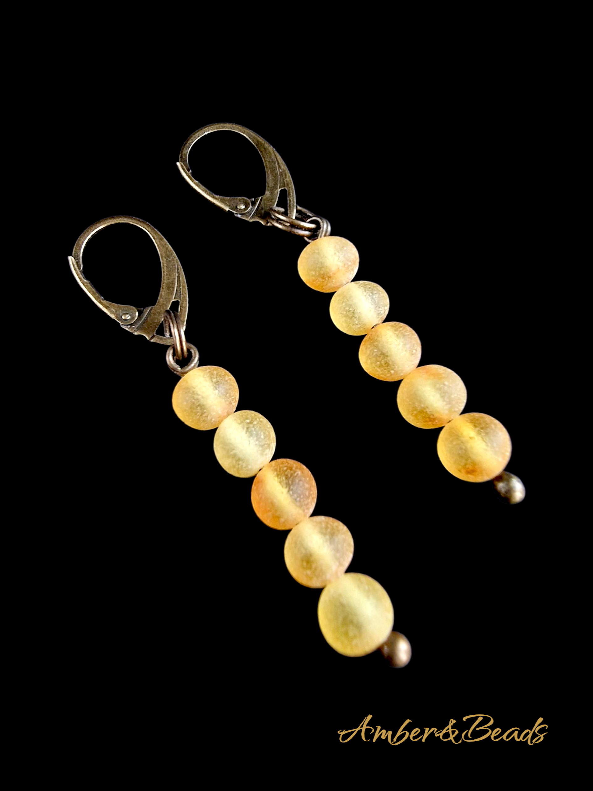 Auskarai pagamint iš gintaro, užsegimas – žalvario spalvos. Auskarų ilgis su užsegimu – 5,5cm, vieno auskaro svoris – 1,5 g. Prie auskarų galima priderinti lariatą su gintaru bei apyrankę.